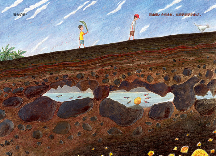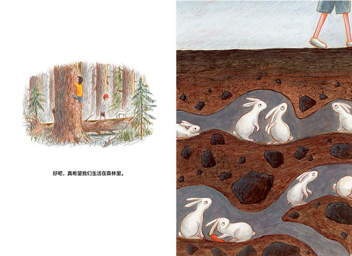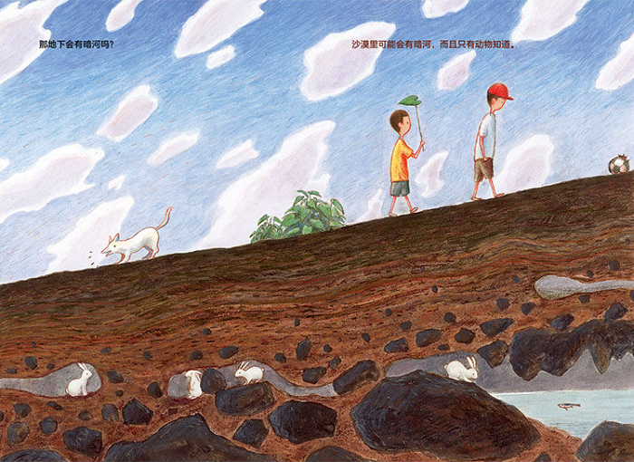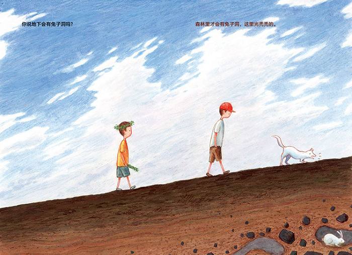 《散步》是在正午发生的故事。 兄弟俩像寻常一样出门散步,越走越远。他们觉得生活的这个地方太普通、太无趣了,总渴望一些新奇的事物。于是弟弟便忍不住猜想:地下有兔子洞吗?有暗河吗?有黄金吗……但每一次都被知识面更广、阅历更丰富的哥哥否定了,只能从幻想中抵达理想的世界。他们对地下一无所知,最后得出了这样一个遗憾的结论:要是生活在别的地方该多好啊!哪怕比这里特别一点点。 但那些我们看不见的东西,真的不存在吗?