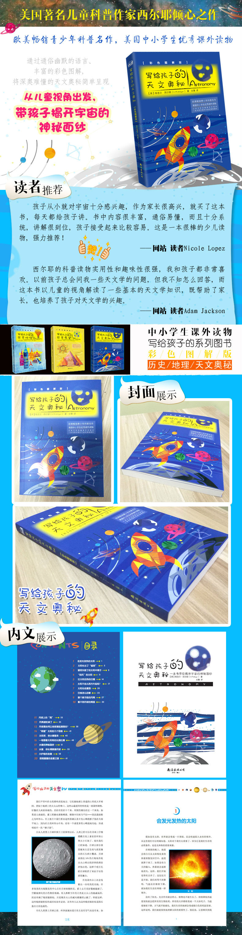 《写给孩子的天文奥秘(彩色图解版 从儿童视角出发,带孩子揭开宇宙的神秘面纱)》以通俗易懂、幽默的语言讲述了天文学的一些常识,从一个孩子的视角出发,把我们白天能看到的太阳、晚上能看到的星星和月亮、我们身处的太阳系和银河系、离我们遥远的河外星系以及人类探索宇宙的过程等分为若干个小故事,将天文奥秘以简单、直接的方式呈现给孩子,让孩子拓宽眼界,对天文知识*有兴趣,并对未知的宇宙充满探索的欲望。