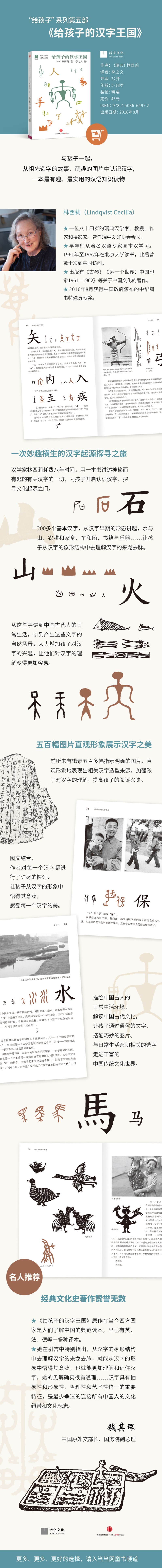 “给孩子”系列第五部《给孩子的汉字王国》是一本外国人为孩子写的讲述汉字故事的书。八十四岁的瑞典汉学家林西莉,出于对汉字的迷恋和好奇,耗费八年时间,总结实际教学与研究经验,用一本书讲述神秘而有趣的有关汉字的一切,为孩子开启认识汉字、探寻文化起源之门。