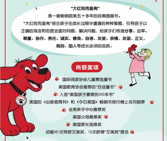 “大红狗克利福德”是畅销童书的经典形象,是主人公女孩艾米丽·伊丽莎白的宠物狗和亲密伙伴。首本“大红狗”故事书出版于1963年2月。之后,“大红狗”图书连续出版了50多种,迄今为止图书销量超过一亿三千万册。