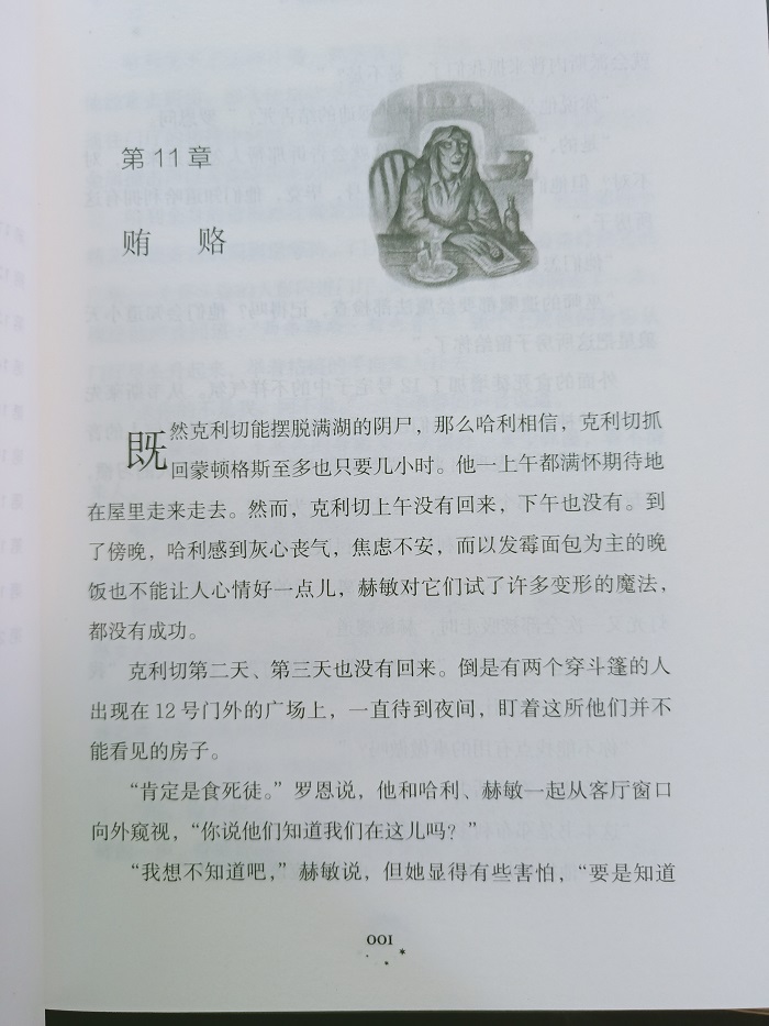 哈利受不了这种斗嘴,悄悄溜出了房间,下楼朝厨房走去。他经常去厨房,因为他相信克利切最有可能在那里出现。但走到通往门厅的楼梯中间时,他听见前门被敲了一下,接着是响亮的金属撞击声以及像链条发出的哗啦哗啦声。