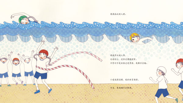 《我不是笨小孩》其实诠释了同一个成长主题的不同方面,它是一本令人心生勇气的绘本。这个故事描述的是一个优秀且好强的小女孩。她游泳出色,她跑步拿冠军,简直就是全能的。可是,她偏偏不会跳绳。自尊心强的她不想因为不会跳绳让人当作笨小孩,于是在朋友面前说谎,假装会跳绳。