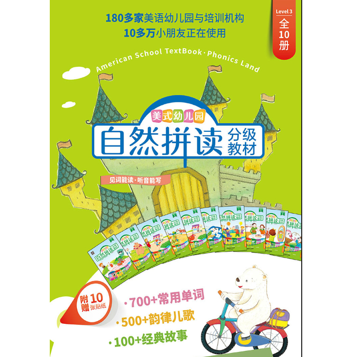 《美式幼儿园自然拼读分级教材•Level 1》共10册书,围绕26个英文字母,通过美式原音领读的方式,教会小朋友学会26个字母的字母音、字母名,以及相关常用单词的自然拼读发音技巧。通过韵律儿歌和趣味故事,辅以游戏试题巩固所学,教孩子辨识字母及字母组合之间的拼读规则,帮孩子建立起字母及字母组合与发音之间的直觉音感,让孩子看到单词就会读,听到发音就会写。