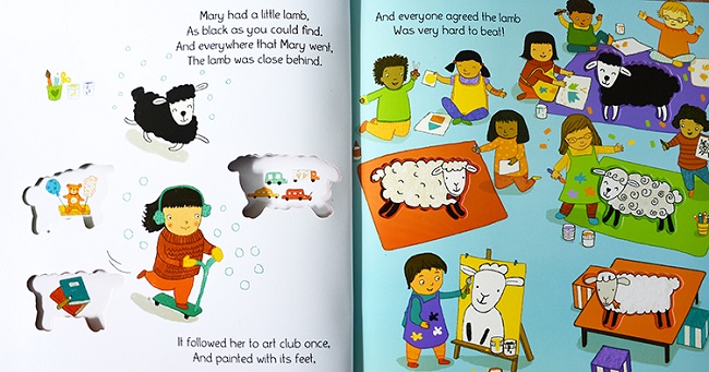 玛丽有七只小羊,每只小羊的羊毛都不同。玛丽带着他们去了很多地方,做了很多有趣的事情,上课、买东西...一天过去了,七只小羊羔陪着疲惫的玛丽进入了梦乡。
