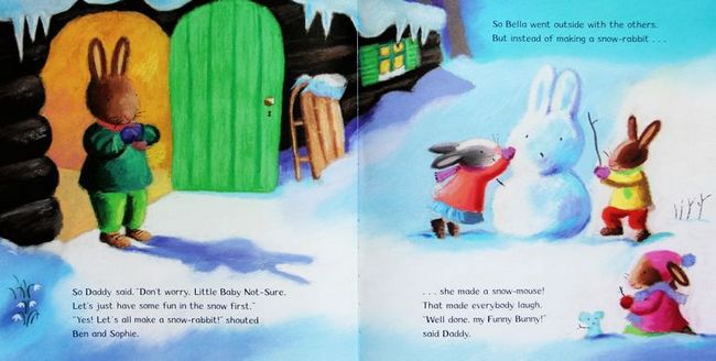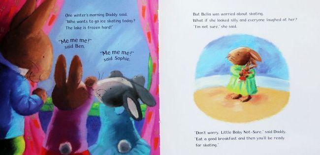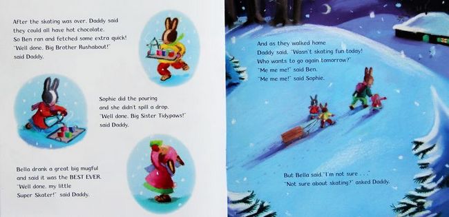 When Daddy Rabbit suggests skating on the frozen lake, Bella’s big brother and sister are excited. But little Bella is nervous. What if she falls over and everyone laughs at her? Gently encouraged by the others, Bella gains confidence and steps out onto the ice – and discovers that she loves skating!