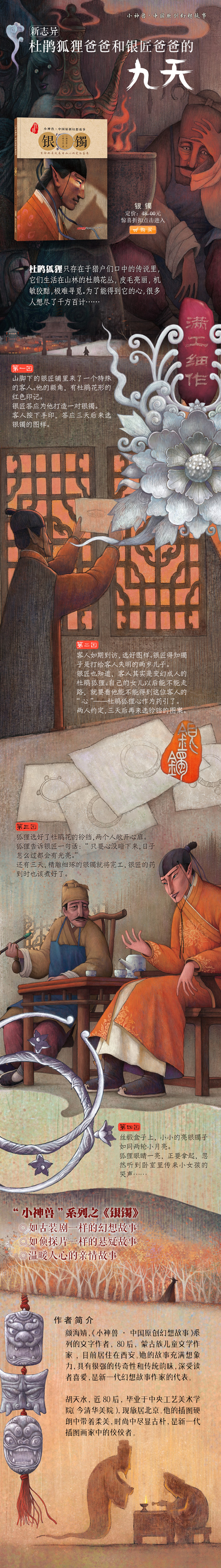 1.构思精巧的故事,如同一部古装侦探剧,在有限的九天时间里,在银匠铺的方寸之地,通过银匠和杜鹃狐狸两人的交手徐徐展开。 2.大师级的插画,色调沉稳,让整本书极具质感。 3.神秘的东方色彩,传说中的杜鹃狐狸让人心生好奇。 4.充满张力的内心戏,看似平淡的表面下暗流汹涌。一个捕猎与被捕猎,设计与被设计的故事,结尾有意外反转。 5.告诉小读者父母亲情之深和人性之善之美。