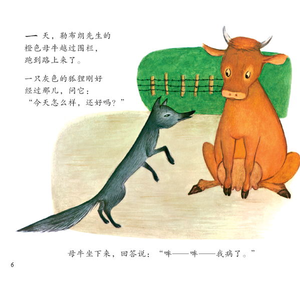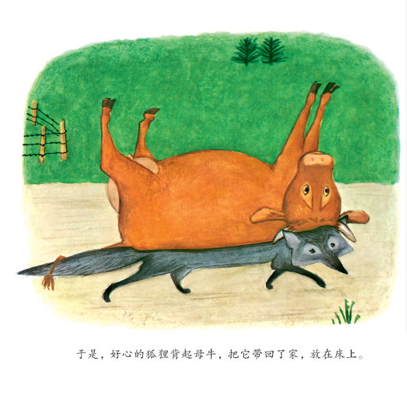 一只母牛生病了,狐狸把它背回了家。 狐狸想用奶嘴给母牛量体温,但是母牛的牙齿太多了。 狐狸想看看母牛的舌头,可是母牛的舌头又长又绿。 狐狸想用热水袋给母牛暖暖脚,但母牛的脚趾头太多了。 这可该怎么办,好心的狐狸能照顾好生病的母牛吗?