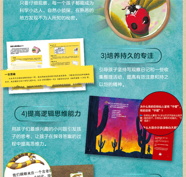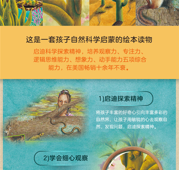 1、来自美国的获奖科普系列,荣获艾萨克·沃尔顿图书联盟奖、跳石荣誉奖、学习杂志教师选择奖三项大奖。   2、热销书作家安东尼·D·弗雷德里克斯耗时十年打造的又一部科普力作,他已出版过129本书,其中40多本童书均获大奖。   3、这是一套孩子自然科学启蒙的很好读物,启迪科学探索精神,培养观察力、专注力、逻辑思维能力、想象力、动手能力五项综合能力,在美国热销十余年不衰。   1)启迪探索精神:将孩子丰富的好奇心引向丰富多彩的自然界,让孩子用敏锐的心去观察自然,发现问题,启迪探索精神。   2)学会细心观察:只要仔细观察,每一个孩子都能成为科学小达人、自然小侦探,在熟悉的地方发现不为人所知的秘密。   3)培养持久的专注:引导孩子坚持写观察日记和一些收集整理活动,提高有效注意和持之以恒的精神。   4)提高逻辑思维能力:用孩子们感兴趣的小问题引发孩子的思考,让孩子在探寻答案的过程中提高思维力。   5)打开想象的翅膀:模拟动物的口吻写信、自制创意广告等活动,充分发挥孩子的想象力和创造力。   6)锻炼小手的灵活性:自制字典、用面团捏动物等游戏提高手眼协调能力和手指的灵活性。   4、中英文双语对照,充满趣味且富有韵律美的文字将每种生物描述得栩栩如生。   5、精美的插图宛如照片般细腻逼真,带给儿童顶端的阅读体验。   6、环保油墨印刷,平装低价实惠。