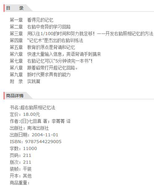 本书倡导全新的记忆方法: 直觉图像能力是右脑记忆的关键;想象训练打开右脑记忆回路;视野扩大训练唤醒“一眼记住全像”能力;运用联想法,取得惊人的记忆效果。 超右脑照相记忆法让你在不知不觉中进入右脑工作状态,学会自由自由操纵右脑,数百倍提高学习效率,*限度发挥右脑能力。 通过超右脑记忆法,你不但能够获得非凡记忆力,还能开发右脑的巨大潜能,从而改善注意力,培养思考能力和创造力。