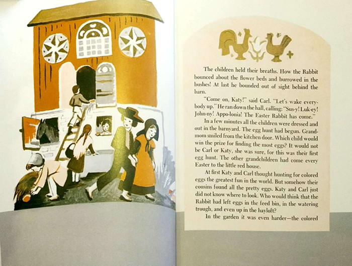 When Katy discovers her grandmother's old hand-painted Easter eggs in the attic, she inspires the renewal of a special tradition: the Easter egg tree! This quaint Caldecott Medal-winning story, written half a century ago, will charm today's readers every bit as much as it did their parents and grandparents. Influenced by Pennsylvania Dutch folk art and tradition, Katherine Milhous creates a lovely tale that will leave readers of all ages impatient to break out paint, dye, and brushes to trim their own Easter egg tree. Muted hues of blue, brown, green, orange, and yellow are a welcome respite from the in-your-face vibrancy of contemporary illustrations, and create their own gentle radiance. Age-old designs such as the Bright and Morning Star, the Horn-blowing Rooster, the Cooing Dove, and the Pomegranate decorate the borders and eggs, providing a sense of deep-rooted history and tradition. A beautiful sleeper of a classic