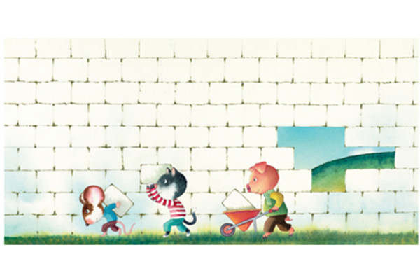 本书是一本无字儿童纸板书,画风可爱、温馨,讲述了一个简单却意义深远的故事:小老鼠的家门口有一面好大的墙,谁也不知道墙外面的世界是什么样子。有一天小老鼠发现墙上长了一朵花,小老鼠摘下花的时候,一块转掉了下来,他看到了一点点墙外的世界,于是小老鼠跟朋友们一块一块地把这些砖块敲下来,原来墙外面是一条小河,河对面还有一群小伙伴!他们灵机一动,把砖一块块的在河中垒起来建了一座桥,2队小伙伴相拥成为了新朋友。让小朋友学会建拆墙建桥的思维,对孩子一生意义很深远。