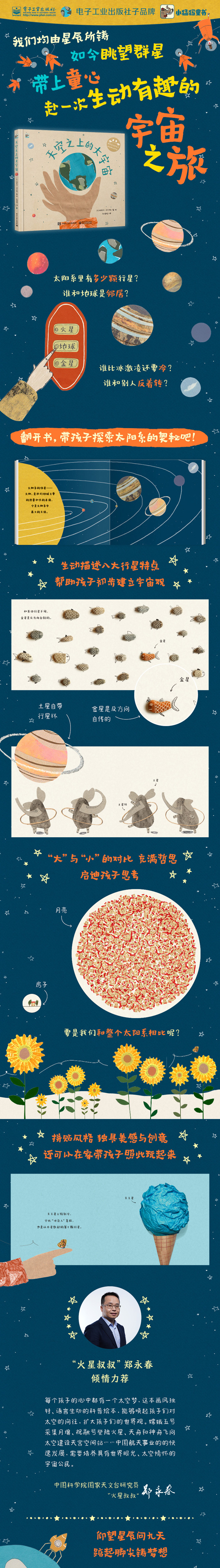 视角独特,直观丰富。我们均由星辰所铸,如今眺望群星。本书以生动有趣、循循善诱的方式讲解太阳系中有趣的科学知识,在孩子心中埋下梦想的种子。 生动活泼,寓教于乐。在介绍太阳系各行星特点的同时,引入“大”“小”的相对概念,用换位思考的方式,引导孩子去观察、发现身边的世界,激发孩子的好奇心与探索欲。