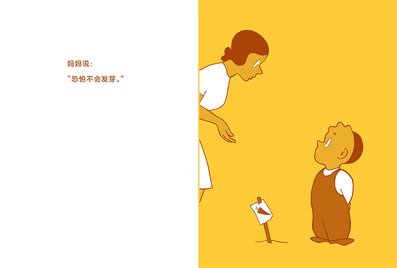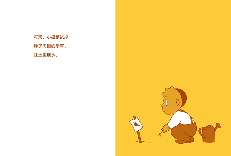 这是一个关于坚持和自信的故事。面对大人们的质疑,小男孩儿以儿童特有的执著、坚定维护了自己的愿望,并尽全力去实现它,最后获得了丰厚回报。作品从故事到图画都非常简单、明了、集中、到位,方便幼儿读者阅读和理解。整片的橙黄的背景为整个故事营造了一种温暖、乐观的氛围,还留存了很大的空间供读者自己去想象、填补。