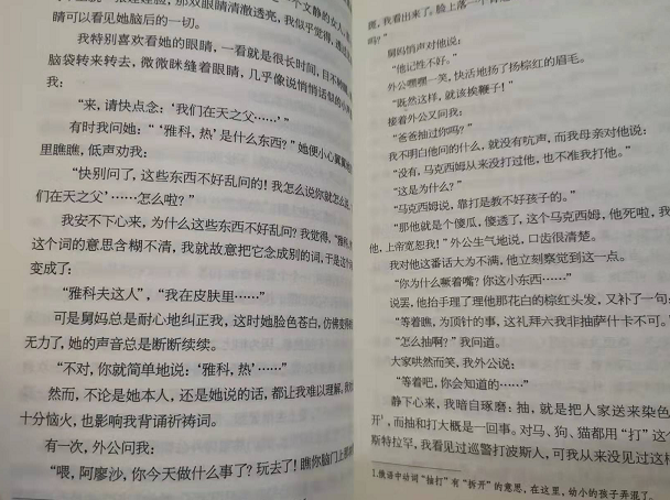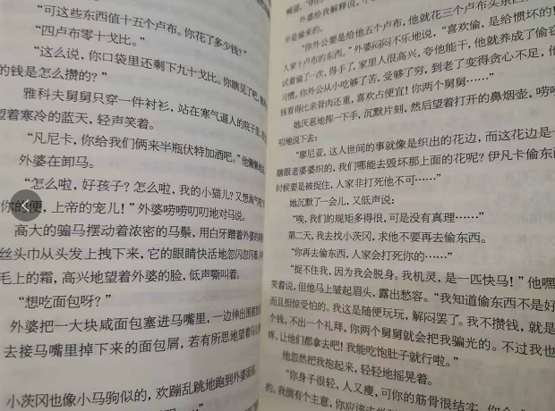 狭小的房间里,光线很暗。父亲直挺挺地躺在窗下的地板上,蒙着白布,身子显得特别长。他的光脚露在外面,脚趾古怪地张开着;那双时常抚爱我的手一动不动地放在胸前,手指也是弯曲的;他那双时常乐呵呵的眼睛紧闭着,眼皮上盖着两枚圆圆的铜币;他那张和蔼的面孔变得乌黑,难看地龇着牙,看上去怪吓人的。 母亲半裸着身子,穿着一条红裙子,跪在父亲身旁,正在用那把小黑梳子给我父亲梳头,把父亲那长长的柔软的头发从前额梳到后脑勺。那把小黑梳子是我喜欢的东西,我常常用它锯西瓜皮。母亲给我父亲梳头的时候,嘴里不停地唠叨着,嗓音低沉、沙哑。她眼睛红肿,仿佛融化了似的,大滴大滴的泪水从她那双浅灰色的眼睛里流下来。 外婆拉着我的手。她长得胖乎乎的,大脑袋,大眼睛,鼻子上皮肉松弛,令人发笑。外婆身子软绵绵的,是个特别有意思的人。这时她穿着一身黑衣裳,也在哭,但她的哭跟我母亲不同,她总是伴随着我母亲哭,像唱歌似的,哭得很老练。她全身颤抖,使劲拉着我,要把我推到父亲身边去。我向后扭着身子,躲在外婆身后,不肯朝前去。我心里害怕,同时又感到难为情。 我还从来没见过大人哭。外婆一再对我说的话,我也不明白是什么意思。 “快去跟你爹爹告别,往后你就见不到他了,他死了,乖孩子,他不该死啊,他还不到年龄……” 我刚刚大病初愈,才能下床走路。我清楚地记得,在我生病期间,父亲照料着我,他总是一副乐呵呵的样子。后来,他突然消失了,外婆接替父亲来照料我。我外婆是个很古怪的人。 “你是从哪儿走来的?”我问外婆。 外婆回答说: “从上头来,从下面来,我不是走来的,是搭船来的!在水上可不能走路,傻瓜!” 她这话真可笑,简直让人莫名其妙。我家楼上住着一些留着大胡子并且染了头发的波斯人,楼下的地下室里住着一个黄脸皮的加尔梅克族老头,是个卖羊皮的小贩。在楼梯的栏杆上可以玩滑滑梯,要是不当心摔倒了,就翻着跟头滚下去,这一点我是再清楚不过了。这里哪儿来的水呢?全是糊弄人,前言不搭后语的,真叫人好笑。 “为什么说我是傻瓜?”