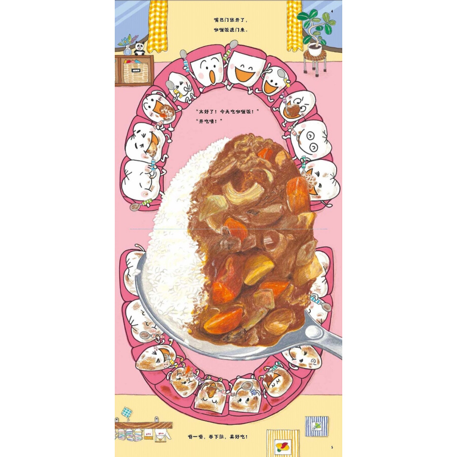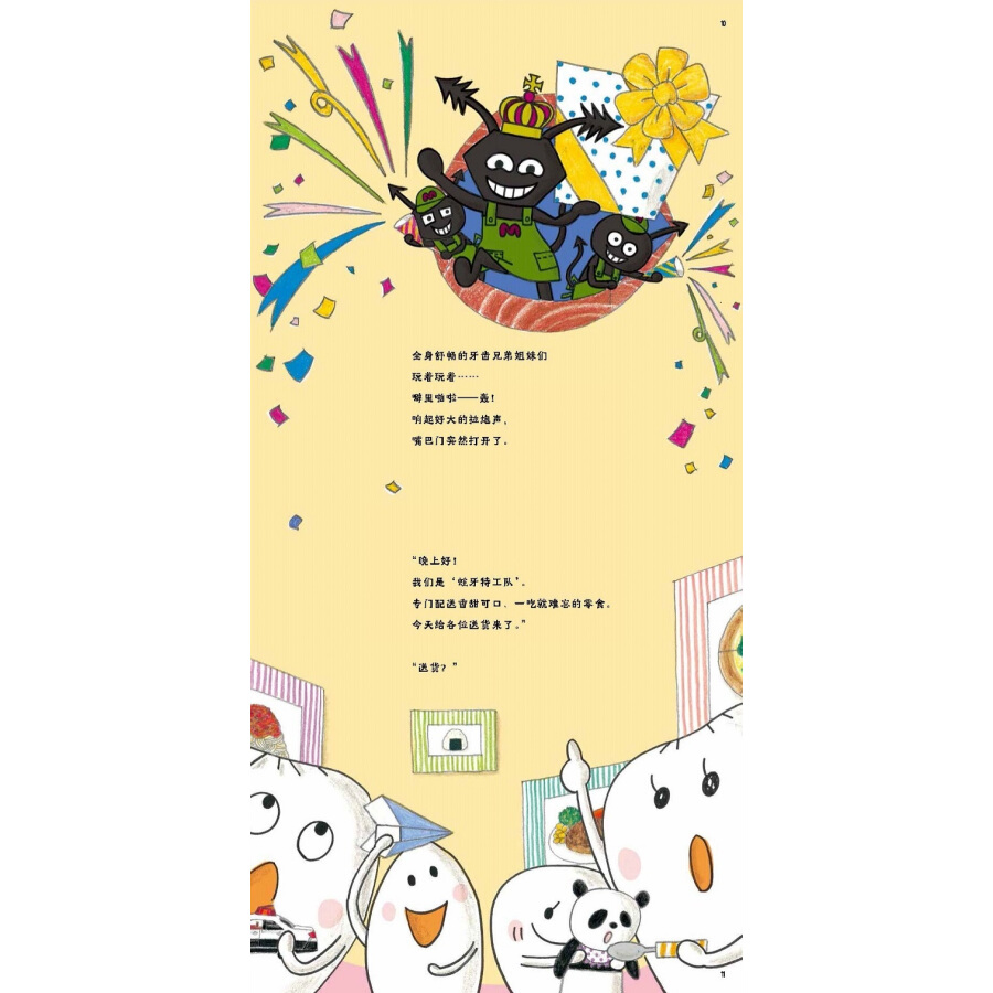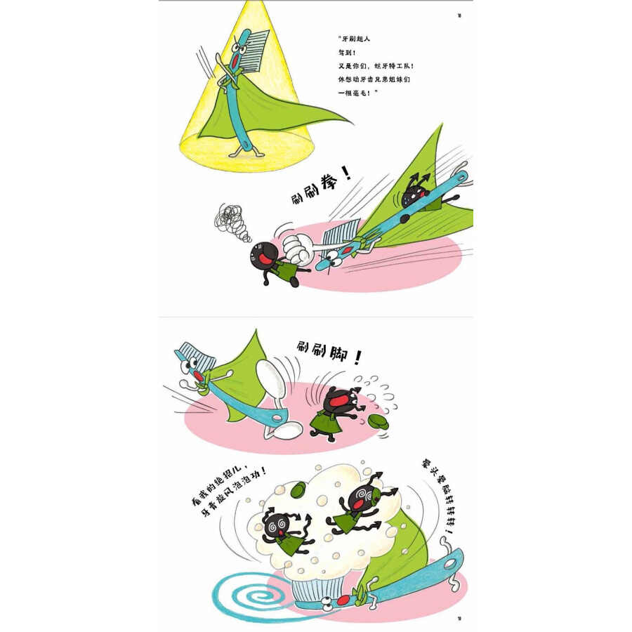 《牙齿一家和牙刷超人》:作者采用拟人的方式,讲述了生活在嘴巴屋里的牙齿兄弟姐妹一家的故事。作者用夸张幽默的文字和图画描绘了牙齿兄弟姐妹如何玩耍、吃饭、睡觉……除了这20个形象、性格都很鲜明的牙齿精灵,出场的还有牙刷超人和蛀牙特工队,当然少不了孩子们喜欢的多种多样的美食……