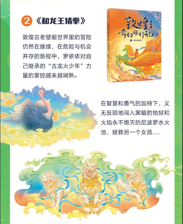 《敦煌奇幻旅行记》是一部中篇的儿童小说,适读年龄为6-14岁。《敦煌奇幻旅行记:和龙王猜拳》是其中的第二本。这套书是以敦煌地区为背景,围绕敦煌壁画、怪兽等展开的儿童文学故事通过虚构的怪兽故事,把敦煌地区的历史文化知识串联起来,以一种吸引力的方式,让孩子快乐吸收。每本都选择一个有趣的主题,把敦煌知识糅合进新奇刺激的奇幻冒险故事中。 敦煌古老壁画世界里的冒险仍然在继续。罗依依虽然没有找到回家的方法,但却慢慢感觉到“古龙火少年”所拥有的力量。 她发现父亲送的骨笛居然可以制服魔王和龙王,她发现自己“爱多管闲事”的脾气,也能为她带来勇气和智慧。她独创黑暗的地狱和火焰不灭的尼波罗水火池,救出了于曹十七娘;她冒险与龙王猜拳,让于阗国免于沉入海底;她智斗白虎,闯入天神们的领地,帮助伙伴寻找真相…… 精彩的历险背后,危险也一直紧跟她身后。 下次穿梭应该就能回家了吧?