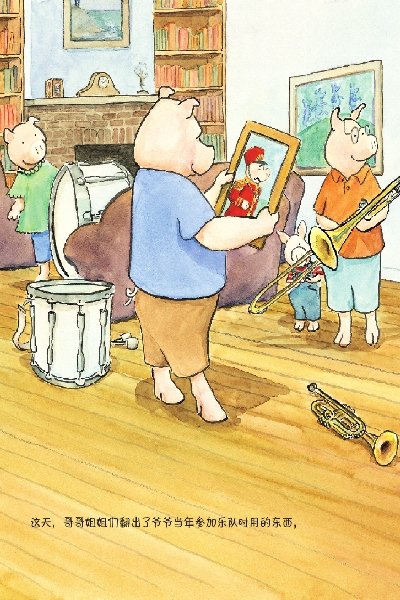 小猪去爷爷家串门,发现猪爷爷家有很多乐器,家庭成员们要组建一个家庭乐队。由于小猪个子太矮,找不到适合自己的乐器,所有他根本就跟不上哥哥姐姐的步伐。哥哥姐姐也只顾自己弹奏乐器,没有空搭理小猪。