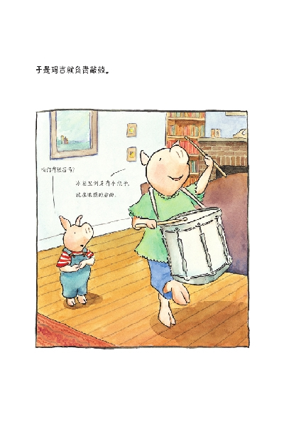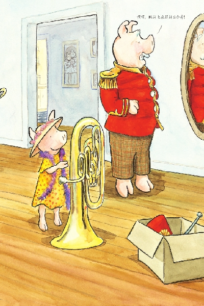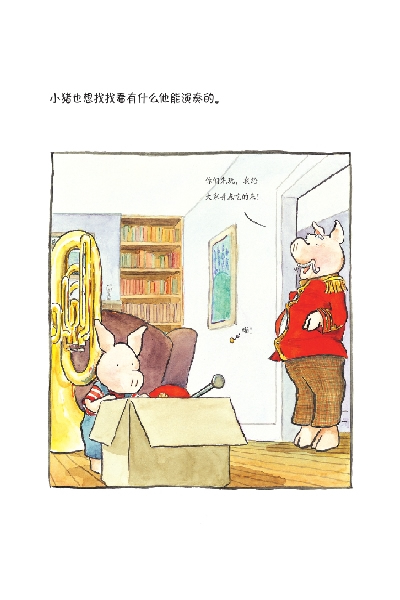 哈哈,这次的阅读主要是为了让宝宝了解西方的乐器,组成一个家庭乐队所需的乐器还真不少呢,鼓、长号、小号、大号,哈哈,乐队当然少不了指挥家!宝宝注意到了猪爷爷箱子里的指挥棒,宝宝最近总拿家里的擀面杖来当指挥棒或者鼓棒,还真是拿他没办法呢,活学活用的精神很好。