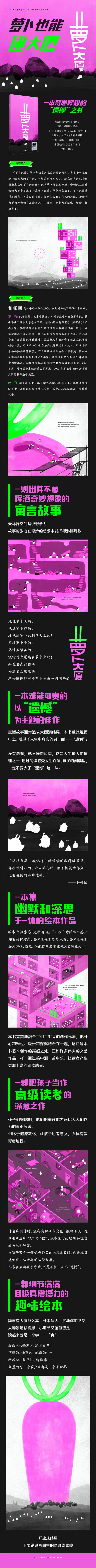 《萝卜大厦》是一部极富想象力的原创绘本。当兔子村里出现一棵巨大的萝卜时,有趣的事情发生了。就在所有的兔子都想着怎么吃萝卜的时候小兔子萝卜特突发奇想,带领大家用牙齿把大萝卜建成了一座萝卜大厦。萝卜特成功了,萝卜大厦建得真漂亮,可是没过多久,住户们又有了自己的想法,开始对大厦用牙齿擅自改造起来……终,萝卜大厦就像一场梦一样消失了。