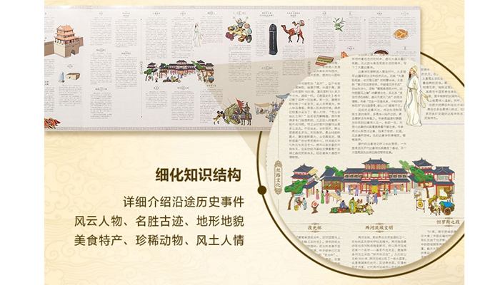 本书全图展开长2m、高38cm,是一本全面介绍丝绸之路的儿童长卷图画书。长卷正面采用手绘的方式展现了丝绸之路沿线的地形地貌、人文风情、名胜古迹、历史典故……背面以文字加图画的形式介绍了与主题相关的知识和故事,并以序号的形式在正面标注其具体的地理位置。