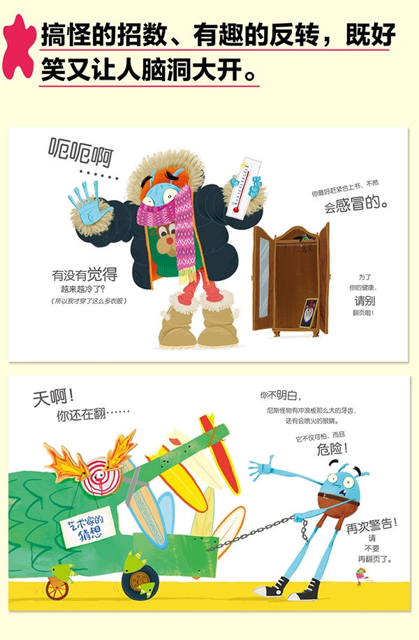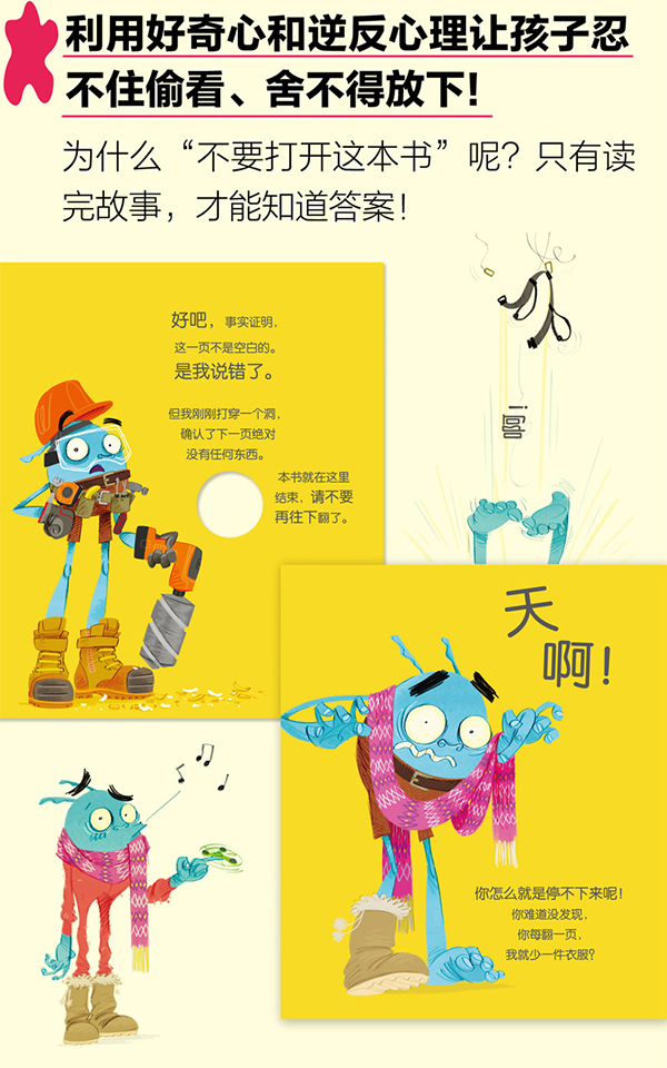 孩子出生后,比起纸质书,可能他们更先接触的,是电子产品。我想我们不是怕孩子们太喜欢电子产品,我们只是怕他们不知道,除了手机和电脑,生活中还有很多东西,是那么有趣。比如,书。本书利用逆反心理,将孩子的探索欲激发起来,诱惑着他们,不断地翻下去、看下去。充满新鲜感的互动性设计,让孩子知道,书还可以如此有趣。和游戏一样,一本书可以是一个游戏,让人捧腹大笑。色彩丰富幽默的插画,将抽象的书具、抽象的思想具象化。将书之“魂”完美呈现。同时,本书献给所有“苦口婆心”的老爸老妈。是你们对付淘气包的制胜宝典!教你们如何用反话让小淘气乖乖听话!