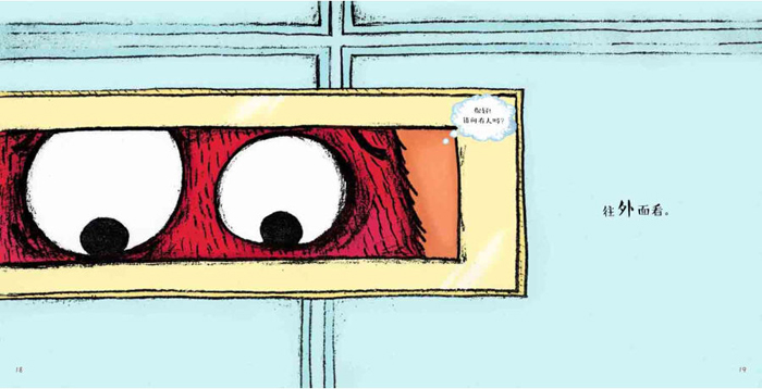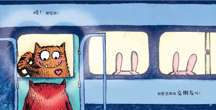 小怪兽丑丑的外表下,有着一颗敏感细腻的心。他希望有人能爱他,包容他,“爱他本来的样子”。瑞秋的绘图有些粗线条的版画风,十分符合小怪兽的形象定位:饱满的紫红色的小怪兽,与淡淡的背景形成鲜明对比,表现了小怪兽的乐天派性格。