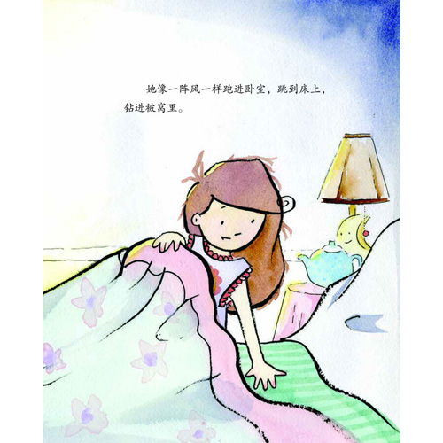 本书就是专门为3-6岁怕黑睡不着的孩子而写的,书里的主人公艾米丽晚上睡不着,她的脑海里显现出数个如果,如果床底下出来一个大犀牛怎么办?如果我睡醒了,发现自己在陌生的地方怎么办?如果睡着了,我的眉毛不见了怎么办?……她越想越害怕,怎么也睡不着。但是她看到她房间里的一切还是原样,玩具、水杯、白色的窗帘、泰迪熊都在,如果我放松自己,在我喜欢的海滩玩耍,跟泰迪熊一起睡觉,放松呼吸,会怎样?她发现,她轻松快乐睡着了。