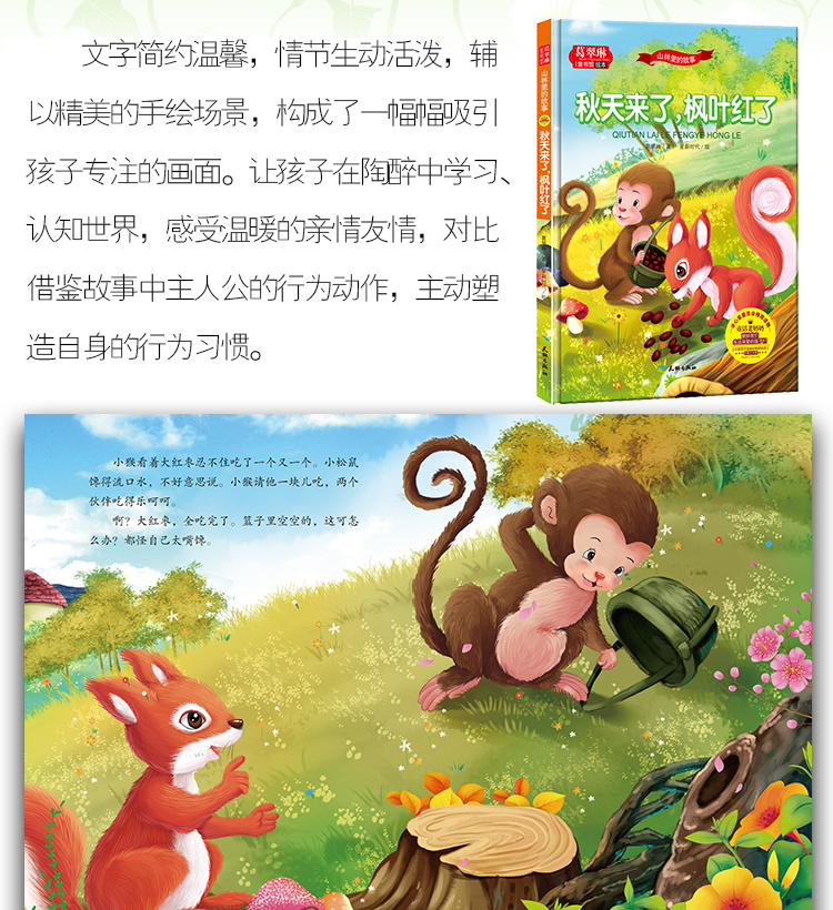 本套书是冰心奖创始人之一的葛翠琳老奶奶献给孩子们的礼物。在书中,葛奶奶用童谣的形式给孩子们描绘了四季中发生在山林里的故事,配以鲜美生动的手绘图画,为孩子们创设了一个个接触自然景色、感受自然气息的“情景”。随着画面的不断变换,能让孩子们体味到自然之美、体会到小动物之间的真挚友情,同时,鲜艳立体的画面,也会带给孩子无尽的真实感受,让她们有更多的想象空间。