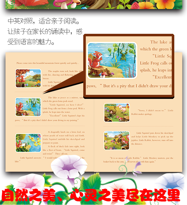 此外,葛奶奶如诗般的文字还配上了英文翻译,在家长的诵读中,使孩子感受到英语独特的韵律美。请你轻轻地、轻轻地走进这美丽的山林……