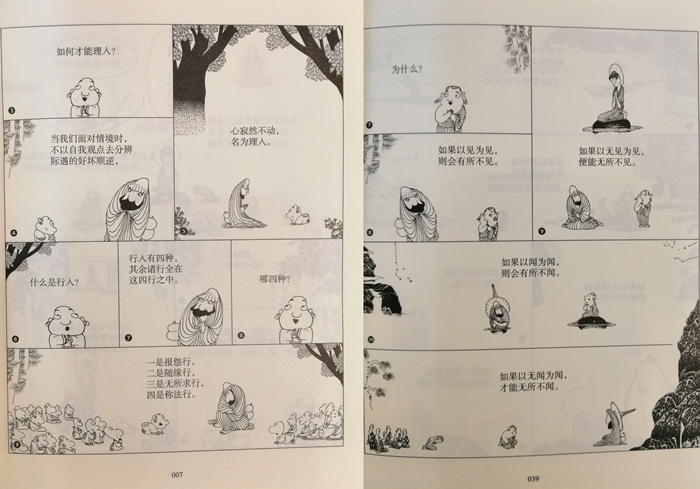“蔡志忠漫画古籍典藏系列”03辑“漫画禅宗思想”包括《漫画金刚经》《漫画心经》《漫画六祖坛经》等10种有关禅宗思想的图书。其中《漫画二入四行论》以菩提达摩的弟子昙林所记录达摩的语录《二入四行论》为底本,以漫画的形式,展现中国禅宗初祖达摩的禅法及禅学理论。禅宗重视内省实修,不立文字,因此《二入四行论》对了解达摩禅法、理解中国禅宗及中国佛教都有着重要意义。蔡志忠的漫画化繁为简,勾勒重点,生趣盎然,为这一经典增色。
