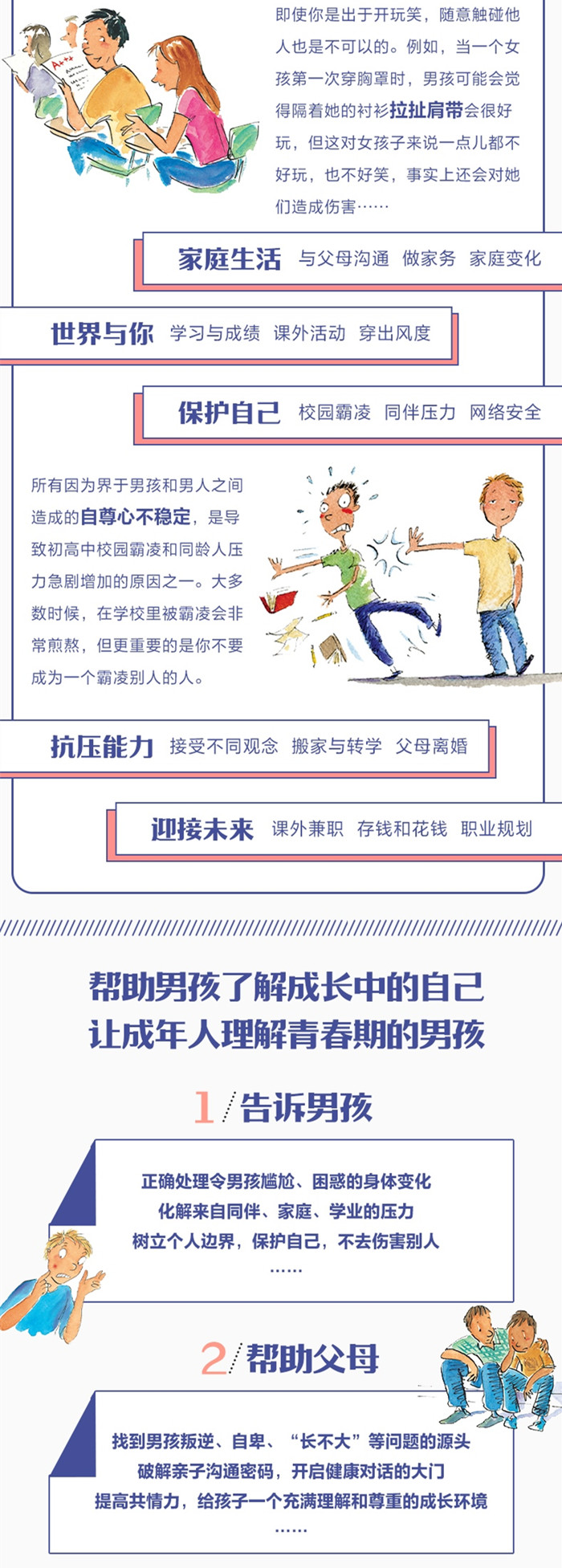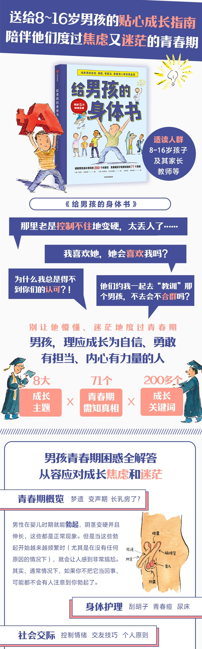 突如其来的身体变化,好尴尬…… 我为什么总是控制不住地发火? 我都长大了,你们能不能别这么管着我! 同伴压力、校园霸凌,我该怎么办? …… 每个成长中的男孩,都在不断地经历来自身体发育、学业压力、外界变化等等挑战,甚至时常在杂乱的信息中迷失自我。 成长并不像看起来那么简单!青春期,真是件让人头疼的事! 《给男孩的身体书》是一本给6-18岁男孩的成长小百科。它以男孩的身体特征和发育状态为基础,用轻松愉快的零距离对话方式,从专业的角度出发,帮助青春期男孩了解成长中的自己,解决遇到的各种现实问题;同时帮助成年人理解青春期男孩,破解亲子间的沟通密码,让孩子在理解、尊重与关爱中长大,从容、自信地拥抱属于他们的未来!