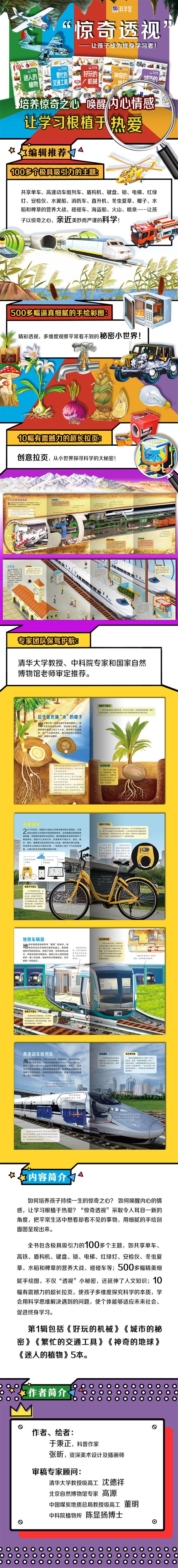 如何培养孩子持续一生的惊奇之心? 如何唤醒内心的情感,让学习根植于热爱?“惊奇透视”采取令人耳目一新的角度,把平常生活中想看却看不见的事物,用细腻的手绘剖面图呈现出来。 全书包含极具吸引力的100多个主题,如共享单车、高铁、盾构机、键盘、锁、电梯、红绿灯、安检仪、冬虫夏草、水稻和稗草的营养大战、碰碰车等;500多幅精美细腻手绘图,不仅“透视”小秘密,还延伸了人文知识;10幅有震撼力的超长拉页,使孩子多维度探究科学的本质,学会用科学思维解决遇到的问题,使个体能够适应未来社会、促进终身学习。 第1辑包括《好玩的机械》《城市的秘密》《繁忙的交通工具》《神奇的地球》《迷人的植物》5本