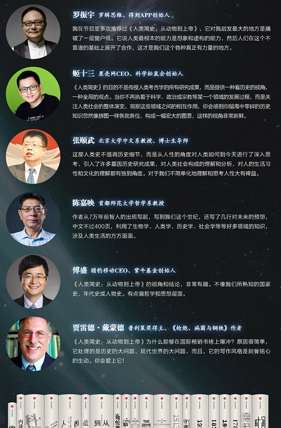 十万年前,地球上至少有六种不同的人,但今日,世界舞台为什么只剩下我们自己?从只能啃食虎狼吃剩残骨的猿人,到跃居食物链*的智人,从雪维洞穴壁上的原始人手印,到阿姆斯特朗登上月球的脚印,从认知革命、农业革命,到科学革命、生物科技革命,我们是如何登上世界舞台成为万物之灵的?从公元前18世纪的《汉谟拉比法典》,到18世纪的美国独立宣言,