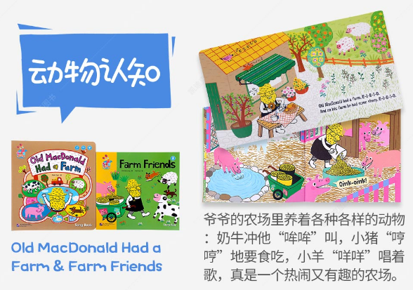 爷爷的农场里养着各种各样的动物:奶牛冲他“哞哞”叫,小猪冲他“哼哼”地要食吃;小羊“咩咩”唱着歌,真是一个热闹又有趣的农场。