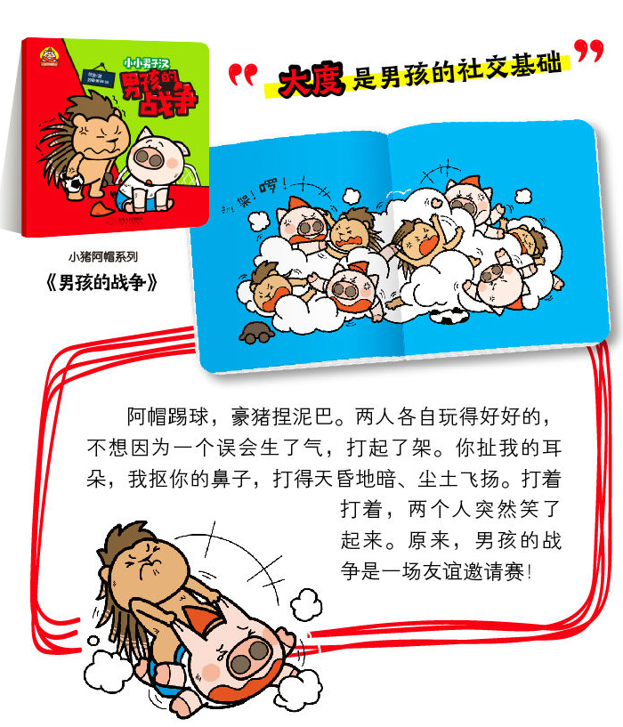 阿帽踢球,豪猪捏泥巴。两人各自玩得好好的,不想因为一个误会生了气,打起了架。你扯我的耳朵,我抠你的鼻子,打得天昏地暗、尘土飞扬。打着打着,两个人突然笑了起来。原来,男孩的战争是一场友谊邀请赛!