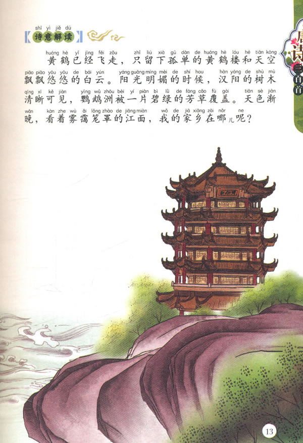 咏鹅骆宾王鹅,鹅,鹅,曲项向天歌。白毛浮绿水,红掌拨清波。诗意解读诗意解读好漂亮的大白鹅!它们的脖子弯弯的,羽毛白白的,正在一边用它们红色的大脚掌划水,一边放声歌唱呢!易水送别骆宾王此地别燕丹,壮士发冲冠。昔时人已没,今日水犹寒。诗意解读诗意解读易水真凉啊!诗人站在岸边,忍不住怀念当年义无反顾地去为国家献身的英雄——荆轲。送杜少府之任蜀州王勃城阙辅三秦,风烟望五津。与君离别意,同是宦游人。海内存知己,天涯若比邻。无为在歧路,儿女共沾巾。诗意解读诗人和好友在路口告别,他觉得只要和好友一同生活在世界上,就算远隔天涯海角,都像在一起时一样。所以,就不要再哭哭啼啼啦。黄鹤楼崔颢昔人已乘黄鹤去,此地空余黄鹤楼。黄鹤一去不复返,白云千载空悠悠。 晴川历历汉阳树,芳草萋萋鹦鹉洲。日暮乡关何处是?烟波江上使人愁。 诗意解读黄鹤已经飞走,只留下孤单的黄鹤楼和天空飘飘悠悠的白云。阳光明媚的时候,汉阳的树木清晰可见,鹦鹉洲被一片碧绿的芳草覆盖。天色渐晚,看着雾霭笼罩的江面,我的家乡在哪儿呢?