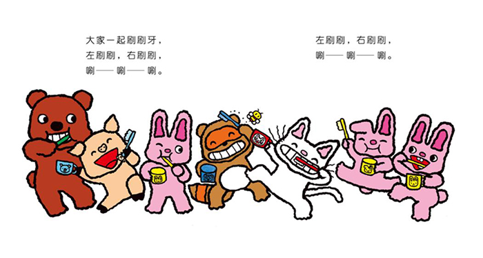 此外,“小猫宝宝1岁了”系列绘本中除了小猫宝宝,还有可爱的动物朋友们——小兔子、小熊、小猪、小狸猫,大家依次说早上好、道晚安,唱刷牙歌……这种反复的叙述形式能一遍遍加深孩子的印象,帮助他们学习语言。