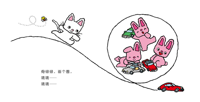 不仅如此,这套书的画面及文字也非常契合低幼宝宝的发展特点。首先,小猫宝宝的形象简洁,辨识度高,粗粗的线条很柔和,给人一种毛茸茸的、温暖的感觉。对婴幼儿来说,水彩画的轮廓模糊,难以引起他们的注意;卡通画会显得过于复杂,孩子也不易接受。“小猫宝宝1岁了”系列绘本采用大片的纯色背景,细节处再配合轮廓清晰的红、黄色块,比如红色的小车和水杯,非常符合1岁宝宝的认知习惯。