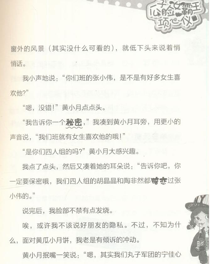 “阳光姐姐小书房”是伍美珍最受小读者欢迎的一套作品。本书的主人公项心怡就是该系列中深受喜爱的明星人物。项心怡是一个瓜子脸的可爱女生,性格大大咧咧,成绩中上游,好打抱不平,人称“瓜子脸女霸王”,本书主要围绕她展开叙述,讲述“女霸王”的家庭和校园生活,风格幽默夸张,校园味十足。
