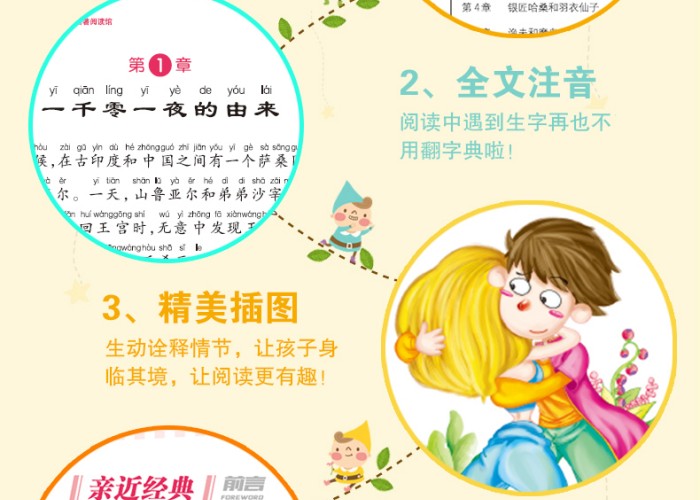 《一千零一夜(注音版)》是世界各国人民熟知的阿拉伯经典文学作品。书中聪明的宰相之女山鲁佐德为阻止国王杀害无辜的女子,自愿嫁给国王,她每晚讲述精彩的故事。使国王为听故事而一再推后杀她的时间。她讲到一千零一个夜晚时,国王终于被感动了。书中曲折动人的故事情节、生动形象的人物。给所有读过《一千零一夜(注音版)》的人都留下了深刻的印象。