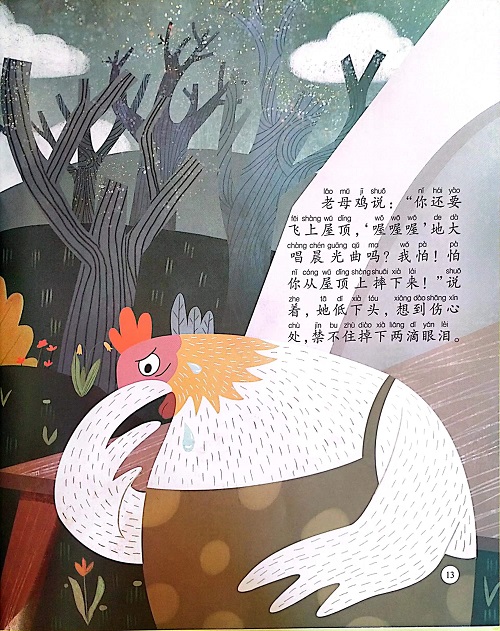 一只早起的老公鸡,它的工作是每天早上的打鸣。而它的老伴儿老母鸡十分关心它的安危,担心它因为工作遇到麻烦。这个故事便是老公鸡一天早上外出工作前与老母鸡的对话。老母鸡从一开始对老公鸡早起和冒险工作的不理解与担心,而后与老公鸡谈论一番后却称赞它,崇拜它和以它为荣。