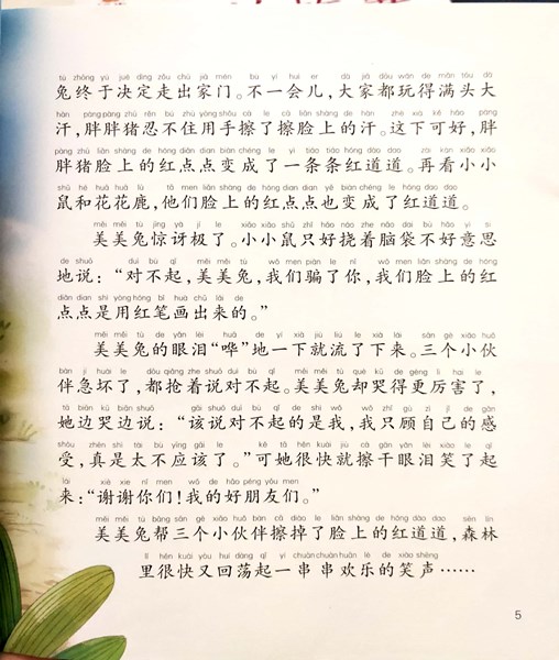 《爱的故事》一书中,鸭宝宝有一个伟大的鸡妈妈,他们是相亲相爱的一家人;贪玩的小云朵再也不贪玩了,因为她想要帮助更多需要帮助的人;嘟啦熊感到很骄傲,因为他的爸爸是个优秀的建筑工人;瘸腿的嘻哈猴有了越来越多的朋友,他的性格也变得开朗起来了……这些美妙而意味深长的经典故事,教会孩子们感受爱、学会爱。本书的插图采用了清新自然的手绘风格,使故事内容得到了完美的展现。《鸡妈妈的鸭宝宝》中,鸡妈妈为了保护鸭宝宝冲向大灰狼的画面极具冲击力;《瘸腿的嘻哈猴》中,采用相框式构图,画面饱满而温馨,丰富而有内涵;《公交车生病了》中,公交车假装生病的特写镜头,生动诙谐,让人忍俊不禁……整本书的插图或温馨自然,或夸张生动,与文字的比例控制得当,张驰有度,非常适合家长和孩子睡前共读。