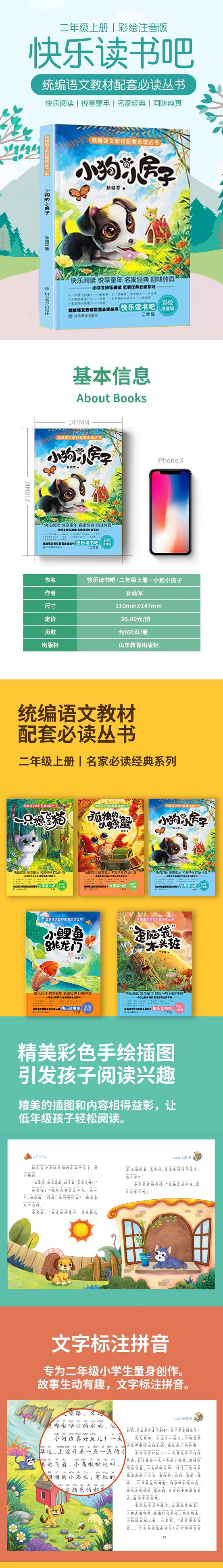 “快乐读书吧”丛书与统编语文教材配套,能够在连接课堂内外、拓展阅读面的同时,提升孩子们的想象力和创造力,给孩子们以丰富的美感,让孩子们从童话故事中领悟人生真谛,养成互相尊重、真诚待人、正直勇敢等美好的品质。 我们去粗取精,选取 名家童话,为孩子们架构出一个天马行空的世界。这个世界奇妙多彩,有一只想飞的猫,有孤独的小螃蟹,有跳龙门的小鲤鱼,还有“歪脑袋”木头桩……扣人心弦的故事情节,生动的童话形象,跃然于纸上,也深刻地印在孩子们的脑海里。 本书包括《小狗的小房子》《叔叔和月亮》《萤火虫找朋友》《小猫做饭》《我叫粗尾巴》等七篇。