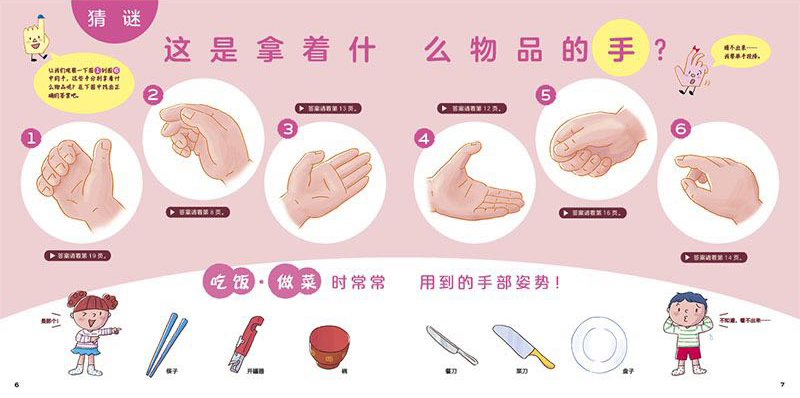 每一章的开头还设计了好玩的猜谜游戏:这是拿着什么物品的手呢?如果猜不出来,那就翻到相应的页码,看看正确答案吧!通过猜谜激发孩子的阅读兴趣,同时也在巧妙引导他们去细致观察图中的手部动作。