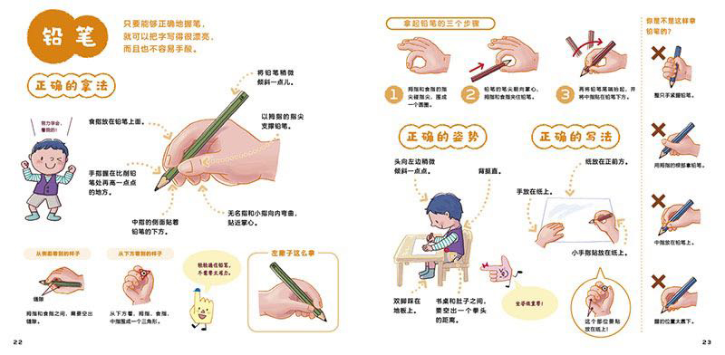 每一种物品都从“正确的拿法”开始,通过清晰的动作图解,帮助孩子掌握手部的姿势和使用物品时的动作要领,还有对错误拿法的纠正,生动有趣的小漫画,让孩子一看就懂。