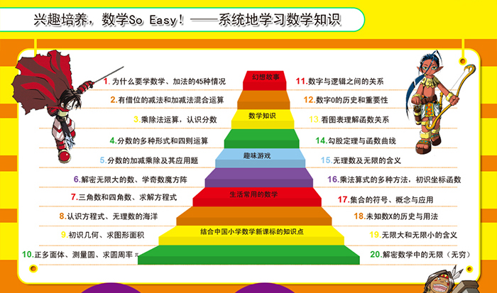 “幻想数学大战”丛书是韩国最受欢迎的数学趣味学习漫画,也是世界上首部把数学知识与漫画巧妙结合起来的学龄儿童课外学习用书。自2004年首次出版以来,该丛书在韩国取得了极大的成功,每本都高居韩国童书畅销榜第1名。该丛书完全不同于单纯的填鸭式灌输法,而是以惊险刺激的故事情节激发儿童对数学的兴趣。该丛书从小主人公知修率领勇敢的精灵和聪明的人类拯救数学世界的故事出发,介绍了数值起源,步步深入,涉及自然数、分数、四则运算等多个概念,循序渐进、轻松易懂,让小读者尽情畅游在数学海洋中。
