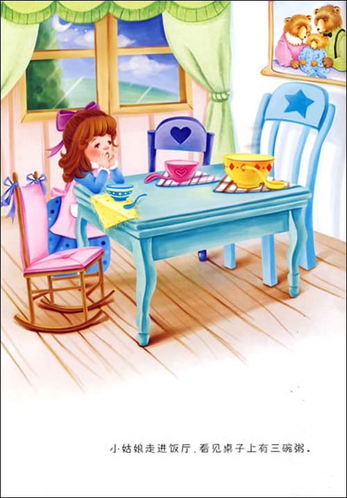 小姑娘在树林里迷了路。她发现了一间房子,在屋子里,住着三只熊。小姑娘看屋里没人,就推门进去了。她发现,小房子里有两个房间,一间是饭厅,一间是卧室。她走进饭厅,看见了桌子上有三碗粥,并把每碗粥都尝了一口,觉得最小的那碗最好。于是,她吃掉了粥,吃饱了还坐了椅子,最后躺在最小的那张床上睡着了。