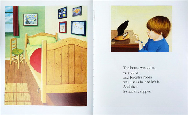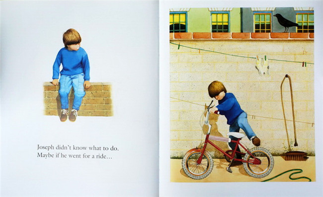 到院子看看或许情况好一点,天呀!怎么足球孵出一只小鸟,水管成了象鼻子、脚踏车轮子也变成了一颗苹果?翻上墙头看看邻居家可好,哇塞!哪来的大怪物……算了算了,把门关好、把灯关掉,躲在房间等爸妈为来吧!门开了,灯亮了,是爸爸、是妈妈,还有……一个小baby-Joseph刚出生的小妹妹。