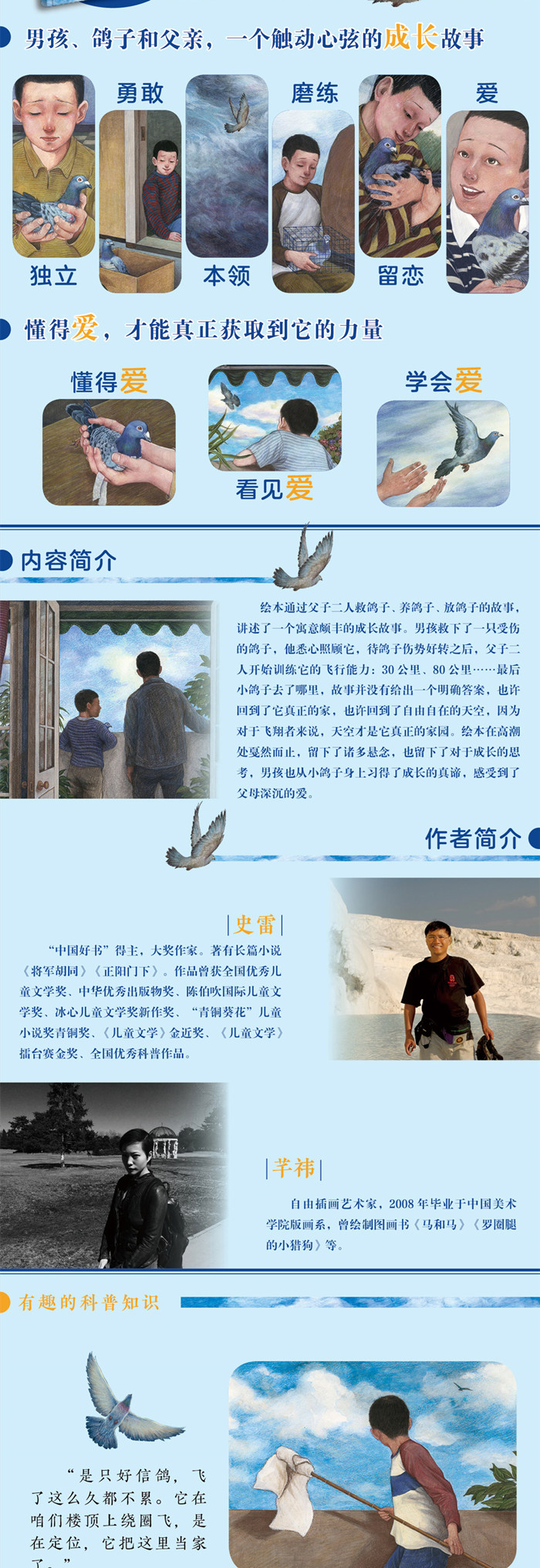 绘本通过父子二人救鸽子、养鸽子、放鸽子,讲述了一个寓意颇丰的成长故事。小主人公救下了一只受伤的鸽子,他悉心照顾它,待鸽子伤势好转之后,父子二人开始训练它的飞行能力:在30公里、80公里……很后小鸽子去了哪里,故事并没有给出一个明确答案,也许回到了它真正的家,也许回到了自由自在的天空,因为对于飞翔者来说,天空才是它真正的家园。绘本在高潮处戛然而止,留下了诸多悬念,也留下了对于成长的思考。孩子的成长同样如此,只有经历了风雨,才能飞向属于自己的人生舞台。