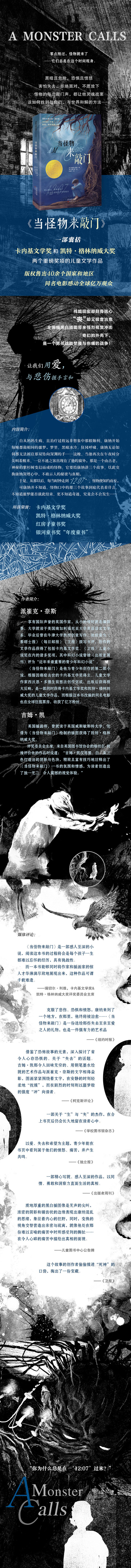 自从妈妈生病,且治疗过程远非想象中那般顺利,康纳开始每晚都做相同的噩梦。梦里,黑暗冰冷,狂风呼啸,康纳无论如何都无法抓住那双坠向深渊的手……这晚,当他再次在午夜时分尖叫着醒来,一位不速之客出现在了他的窗外。那是一个由古老、神秘的紫杉树变幻而成的怪物,它要给康纳讲三个故事,以此交换康纳深埋心中、不敢示人的秘密与真相。 于是,从那以后,每当时钟走到“12:07”,怪物便如约而至。 可康纳并不知道,怪物口中的那三个故事到底代表着什么,不知道噩梦能否就此结束,更不知道奇迹,究竟会不会发生……
